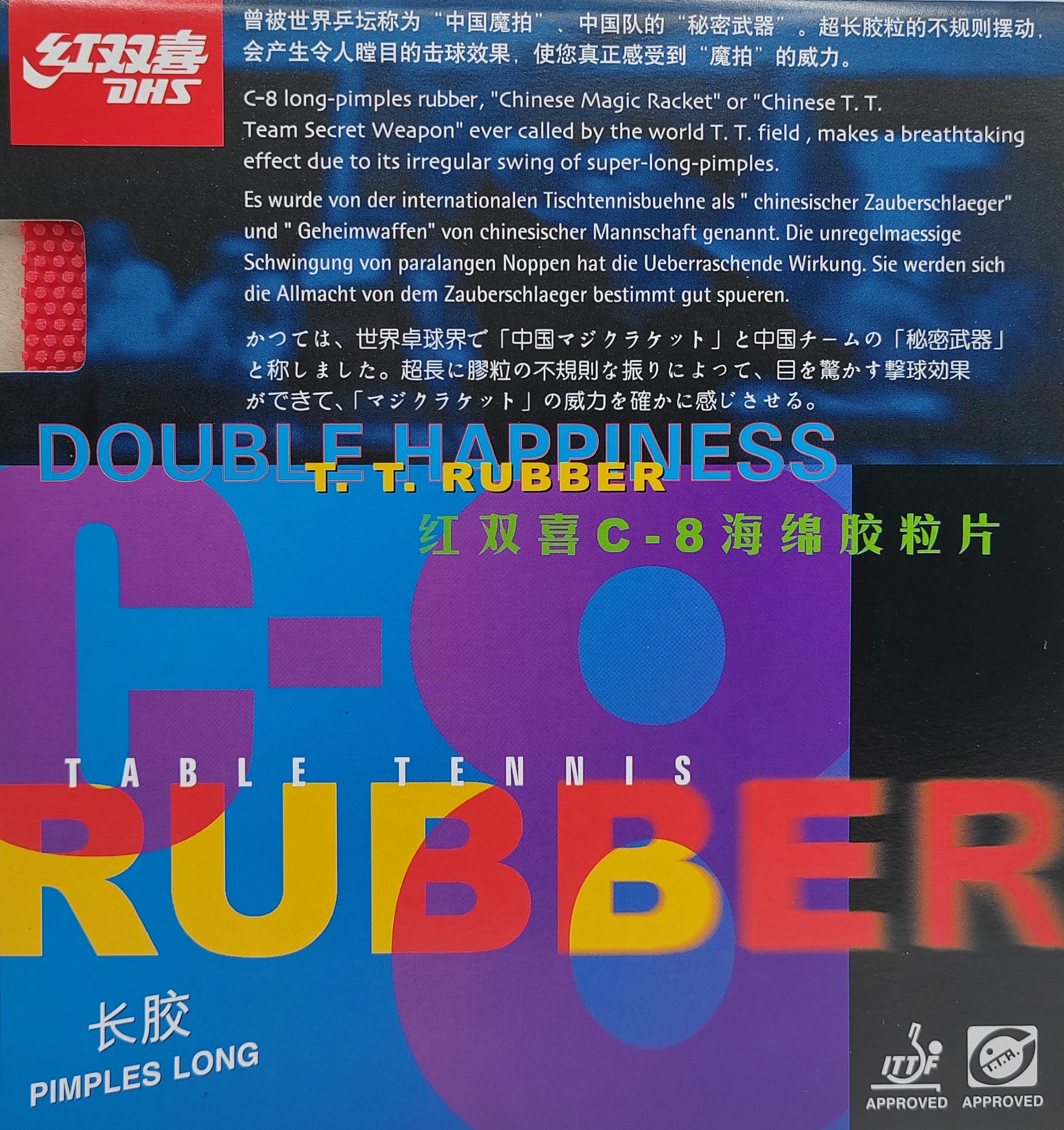 Le DHS C8 est un revêtement picots longs, surnommé "Arme secrète de l'équipe chinoise" ou "Raquette magique chinoise", il crée des effets perturbateurs et irréguliers.