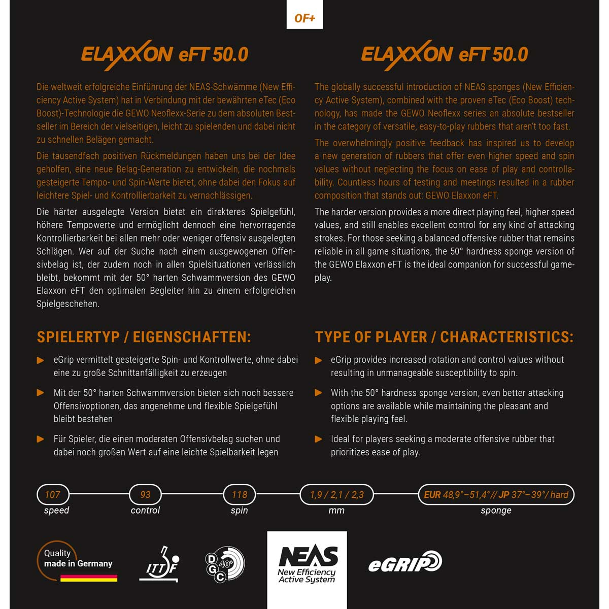 La version plus dure offre une sensation de jeu plus directe, des valeurs de vitesse plus élevées et permet toujours un excellent contrôle pour tous types d’attaques. Pour ceux qui recherchent un caoutchouc offensif équilibré qui reste fiable dans toutes les situations de jeu, la version mousse de dureté 50° du GEWO Elaxxon eFT est le compagnon idéal pour un jeu réussi.