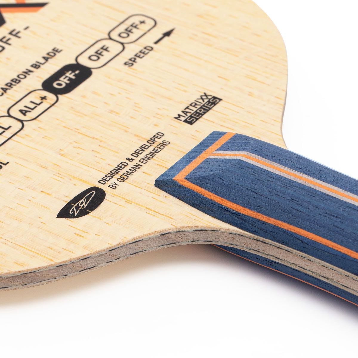 La variante légèrement plus contrôlée de la série Matrixx présente un pli hybride aramide-carbone qui s’enroule autour du pli central kiri plus doux. Cette configuration offre un excellent support pour les stratégies de topspin, et même à mi-distance, le GEWO Matrixx ARC Inner OFF- permet un jeu offensif puissant. Les plis koto externes assurent la stabilité nécessaire pour des prises proches de la table, tandis que les plis ayous intermédiaires donnent au bois sa touche spéciale – et au moment décisif, il délivre encore beaucoup de puissance.