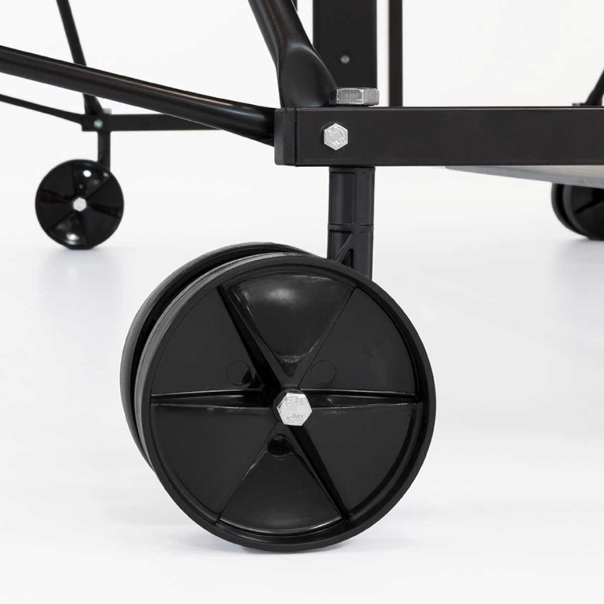 Cette table abordable et robuste, Made in Germany, est la solution idéale pour les joueurs loisir dans le jardin, l’allée ou tout autre emplacement extérieur. Équipée d’un chariot de transport, les moitiés pliables se montent et se démontent facilement grâce aux doubles roues pivotantes.