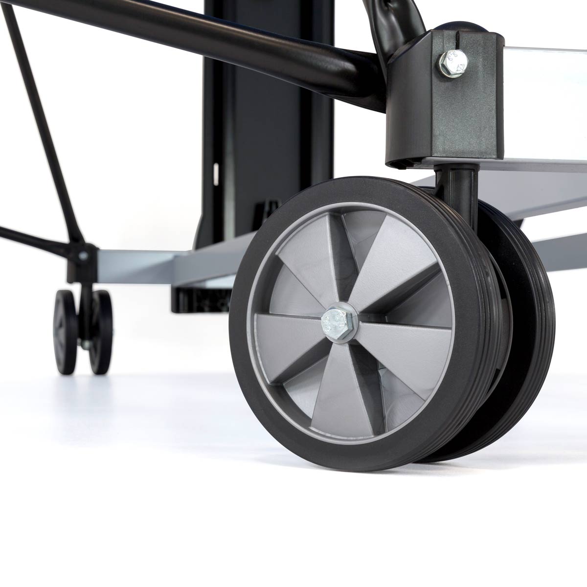 - 4 doubles roues (diamètre 128 mm) avec surface caoutchouc, toutes pivotantes